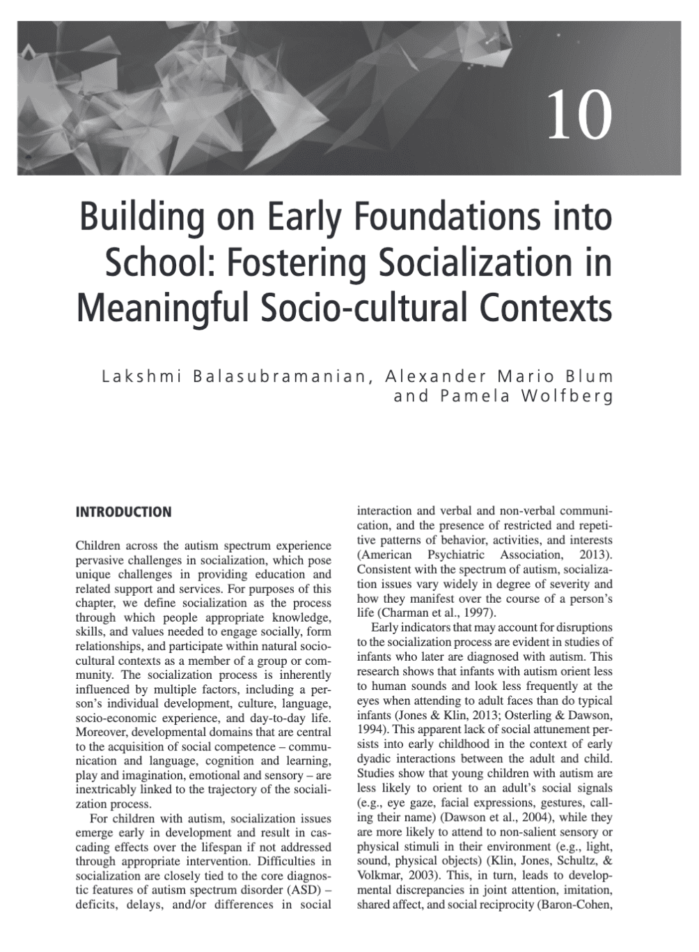 Balasubramanian, L., Blum, A. M., & Wolfberg, P. (2019). Building on Early Foundations into School: Fostering Socialization in Meaningful Socio-cultural Contexts. In R. Jordan, J. M. Roberts, & K. Hume (Eds.), The SAGE Handbook of Autism and Education (pp. 134–153). https://doi.org/10.4135/9781526470409.n13