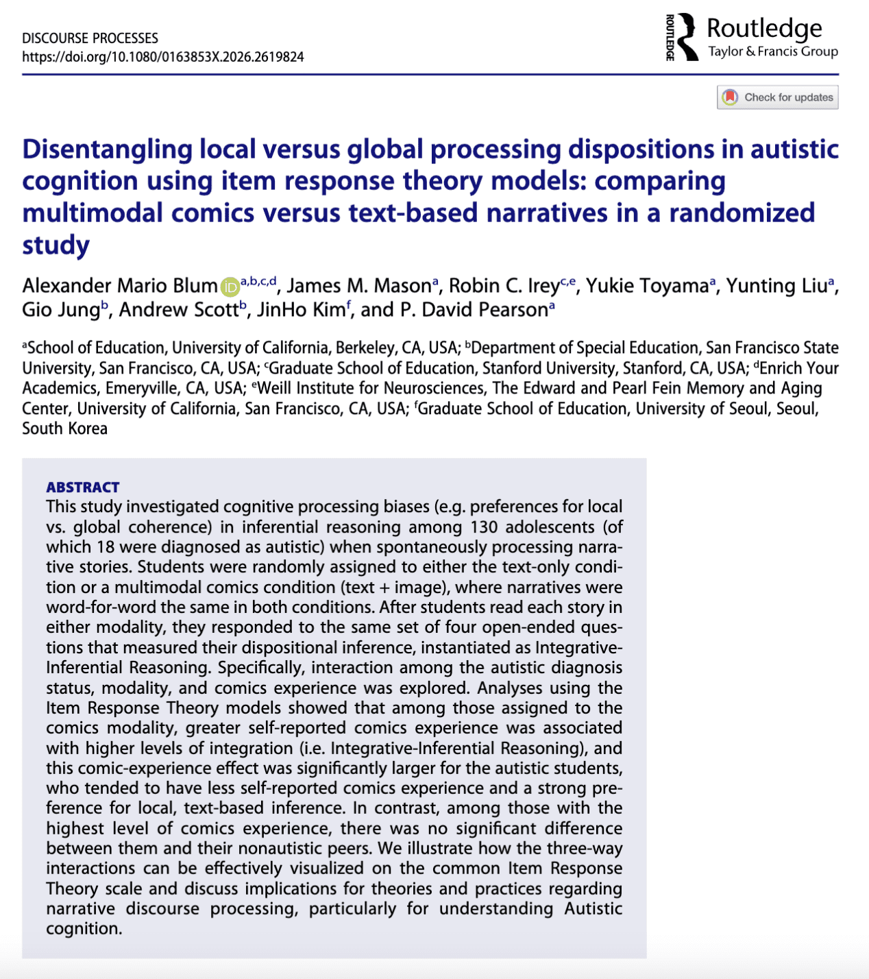 Blum, A. M., Mason, J. M., Irey, R. C., Toyama, Y., Liu, Y., Jung, G., Scott, A., Kim, J., & Pearson, P. D. (2026). Disentangling local versus global processing dispositions in autistic cognition using item response theory models: comparing multimodal comics versus text-based narratives in a randomized study. Discourse Processes, 1–24. https://doi.org/10.1080/0163853x.2026.2619824