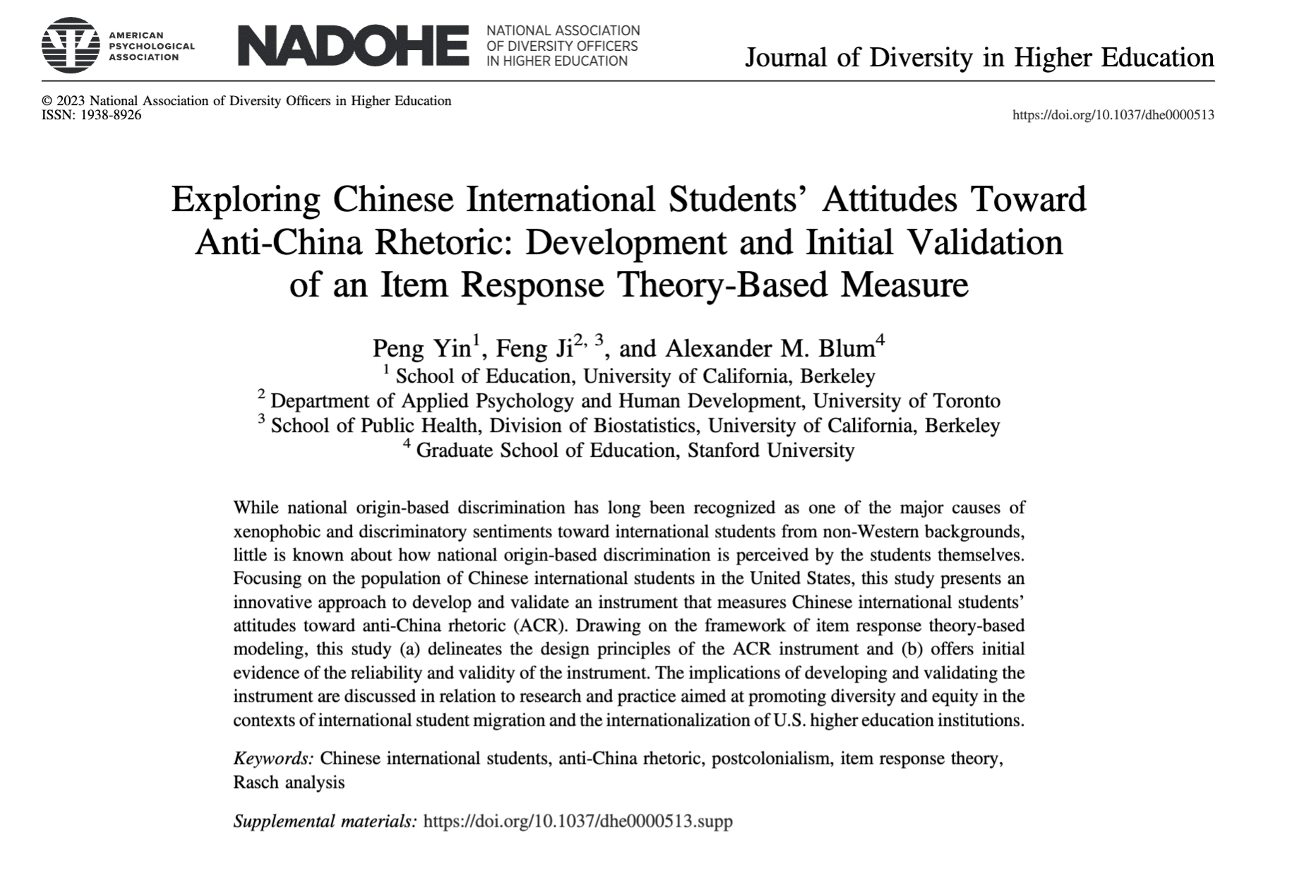 Yin, P., Ji, F., & Blum, A. M. (2025). Exploring Chinese international students’ attitudes toward anti-China rhetoric: Development and initial validation of an item response theory-based measure. Journal of Diversity in Higher Education, 18(3), 240-252. https://doi.org/10.1037/dhe0000513