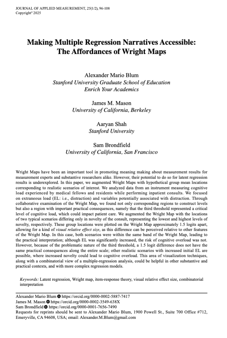 Blum, A. M., Mason, J. M., Shah, A., & Brondfield, S. (2024). Making multiple regression narratives accessible: The affordances of Wright maps. Journal of Applied Measurement.
