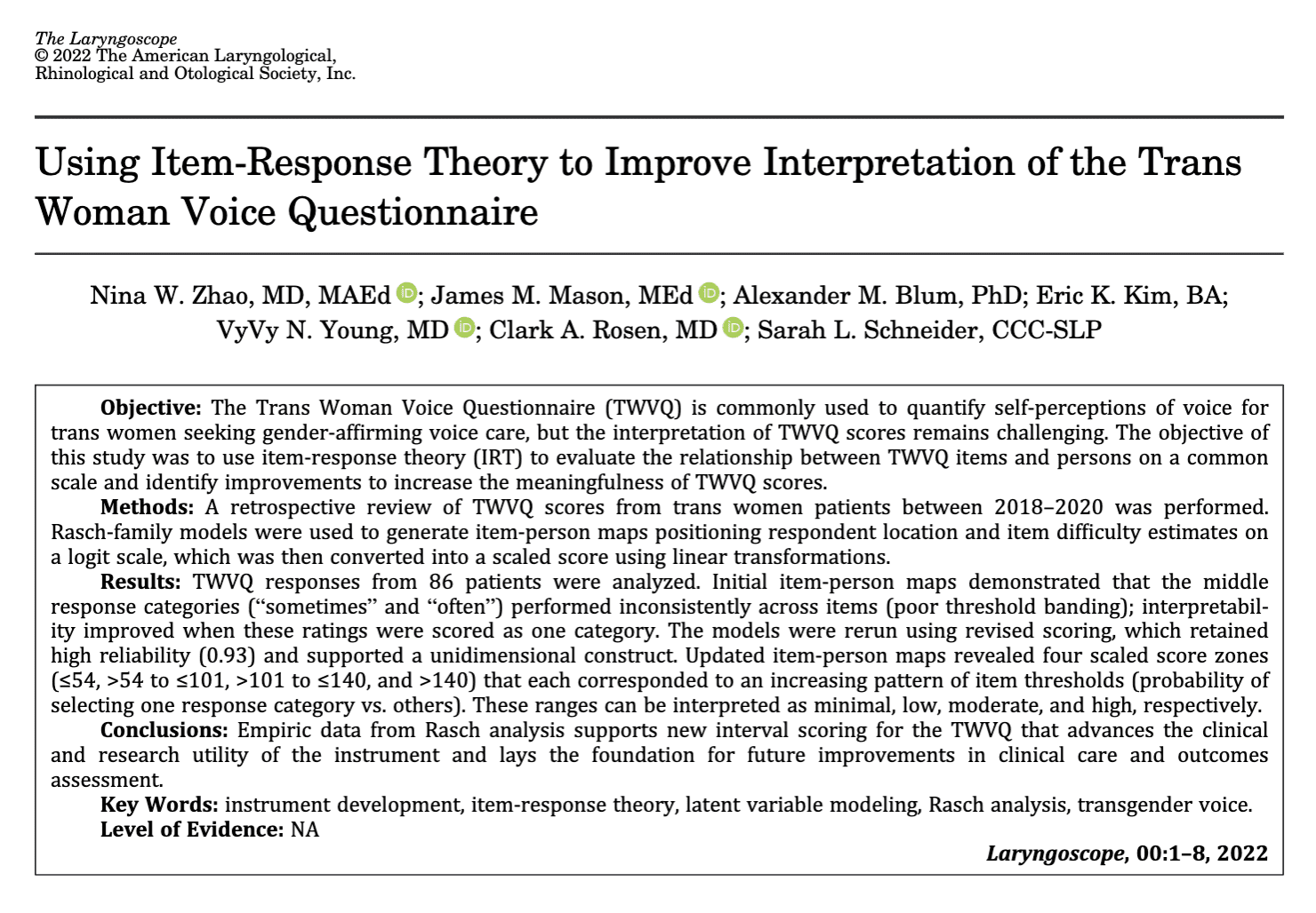Zhao, N.W., Mason, J.M., Blum, A.M., Kim, E.K., Young, V.N., Rosen, C.A. and Schneider, S.L. (2023), Using Item-Response Theory to Improve Interpretation of the Trans Woman Voice Questionnaire. The Laryngoscope, 133: 1197-1204. https://doi.org/10.1002/lary.30360