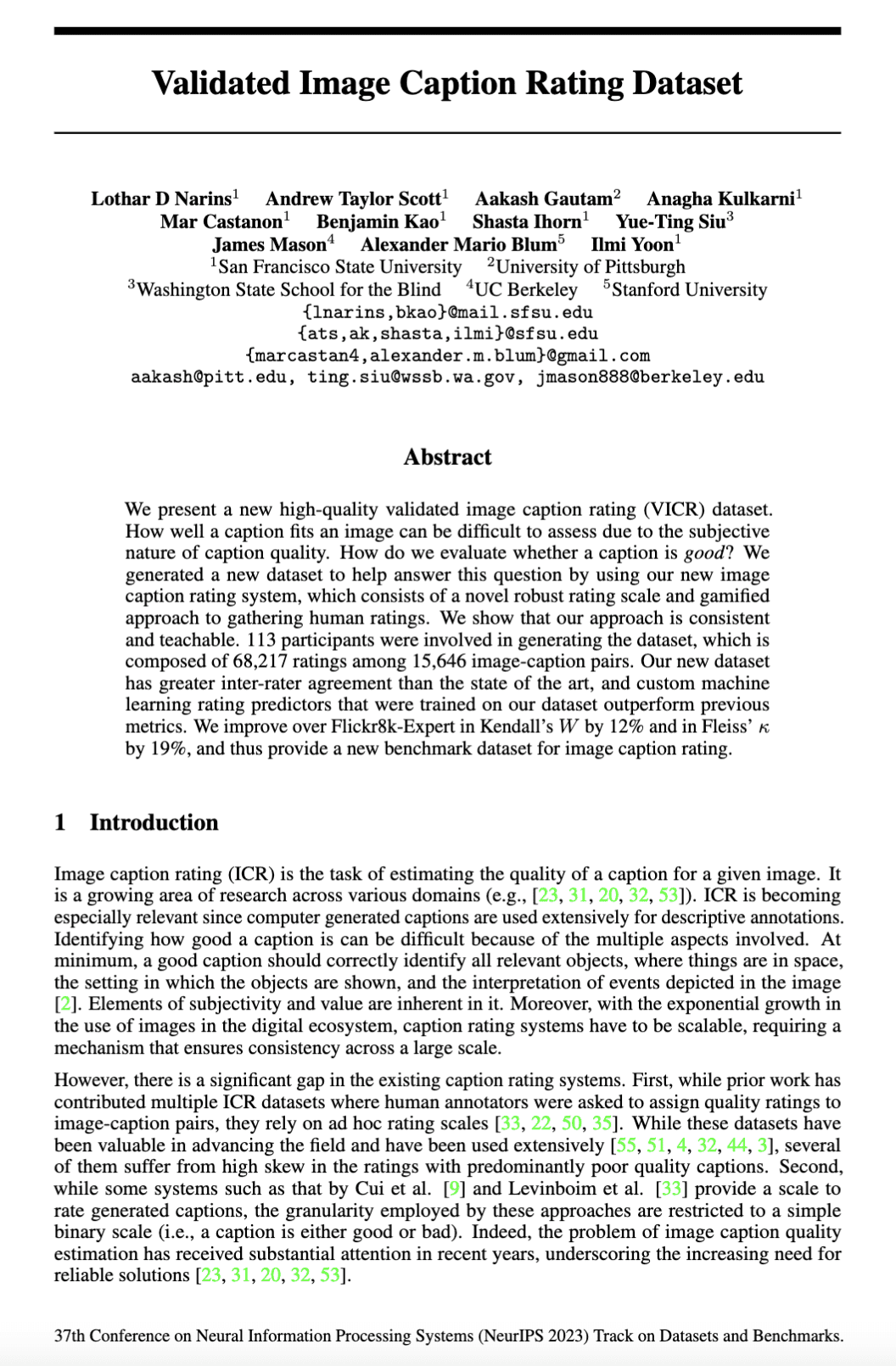 Narins, L. D., Scott, A. T., Gautam, A., Kulkarni, A., Castañón, M., Kao, B., Ihorn, S., Siu, Y., Mason, J. M., Blum, A., & Yoon, I. (2023). Validated Image Caption Rating Dataset. Neural Information Processing Systems, 36, 61292–61305. https://proceedings.neurips.cc/paper_files/paper/2023/hash/c0b91f9a3587bf35287f41dba5d20233-Abstract-Datasets_and_Benchmarks.html