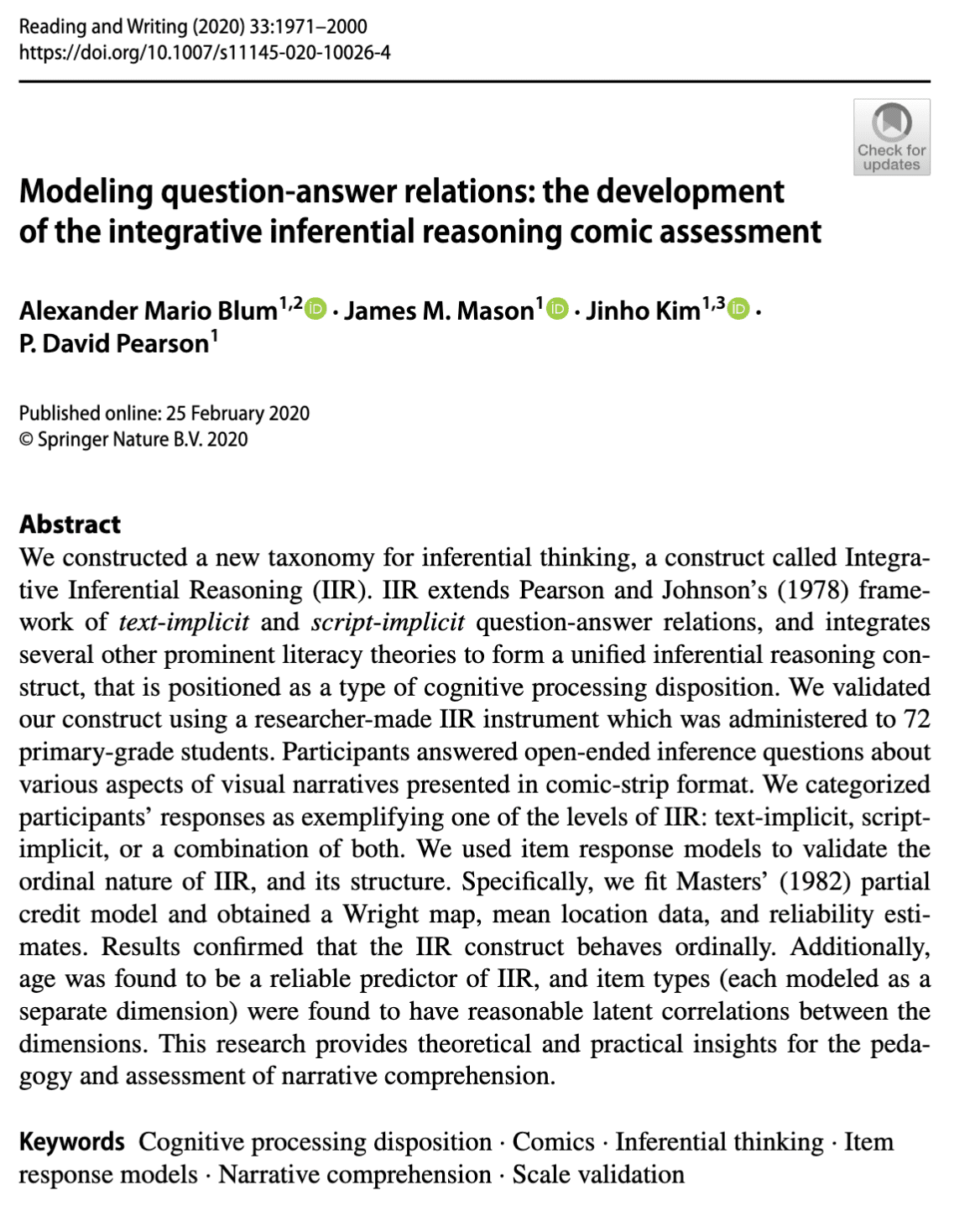 Blum, A. M., Mason, J. M., Kim, J., & Pearson, P. D. (2020). Modeling question-answer relations: the development of the integrative inferential reasoning comic assessment. Reading and Writing. https://doi.org/10.1007/s11145-020-10026-4