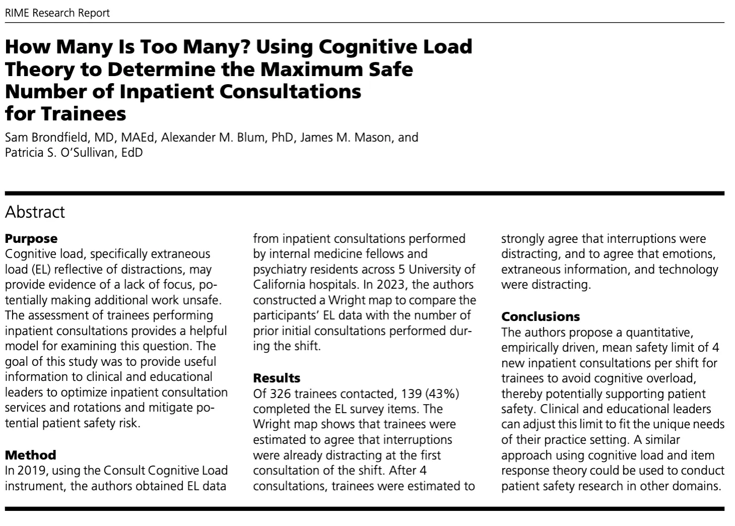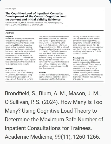 Brondfield, S., Blum, A. M., Mason, J. M., O'Sullivan, P. S. (2024). How Many Is Too Many? Using Cognitive Load Theory to Determine the Maximum Safe Number of Inpatient Consultations for Trainees. Academic Medicine, 99(11), 1260-1266.
